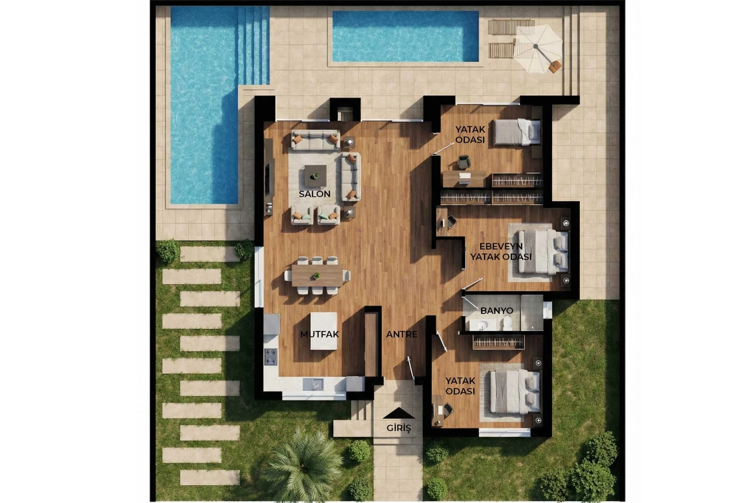 Manila Model, modern mimarinin sade ve dengeli çizgilerini yansıtan tek katlı villa tasarımıdır. Düz çatı formu ve geometrik cephe kurgusu, yapıya güçlü ve çağdaş bir görünüm kazandırır. Geniş pencere açıklıkları sayesinde iç mekânlarda ferah ve aydınlık bir yaşam alanı oluşturulmuştur. Manila Model, fonksiyonel planlaması ve minimal mimari yaklaşımıyla modern yaşam beklentilerine uygun bir konut anlayışını temsil eder.