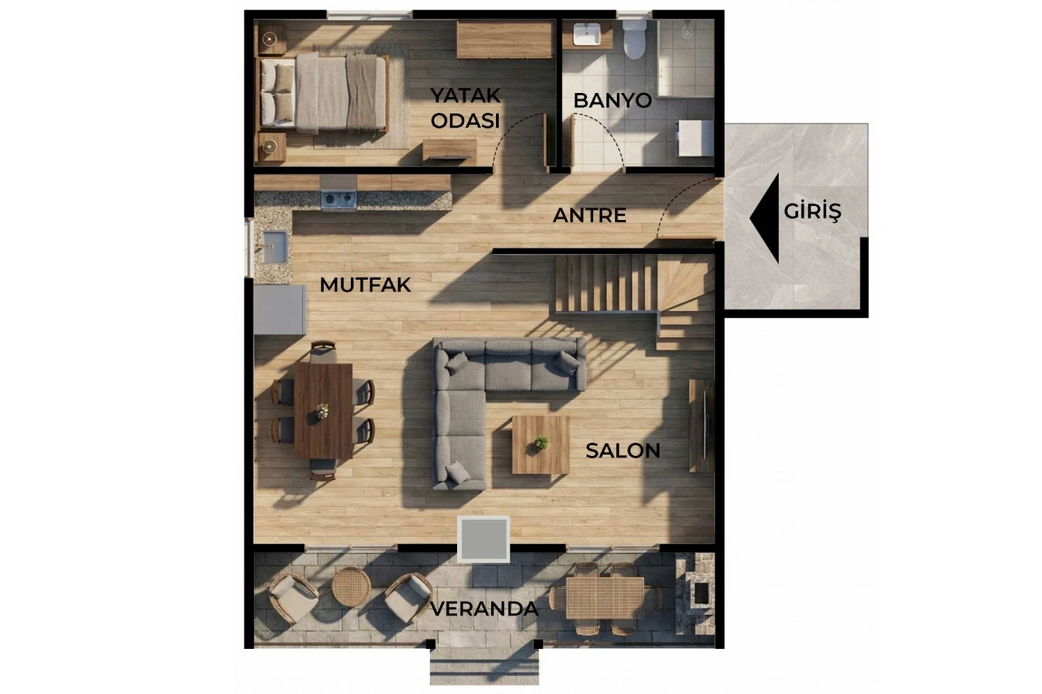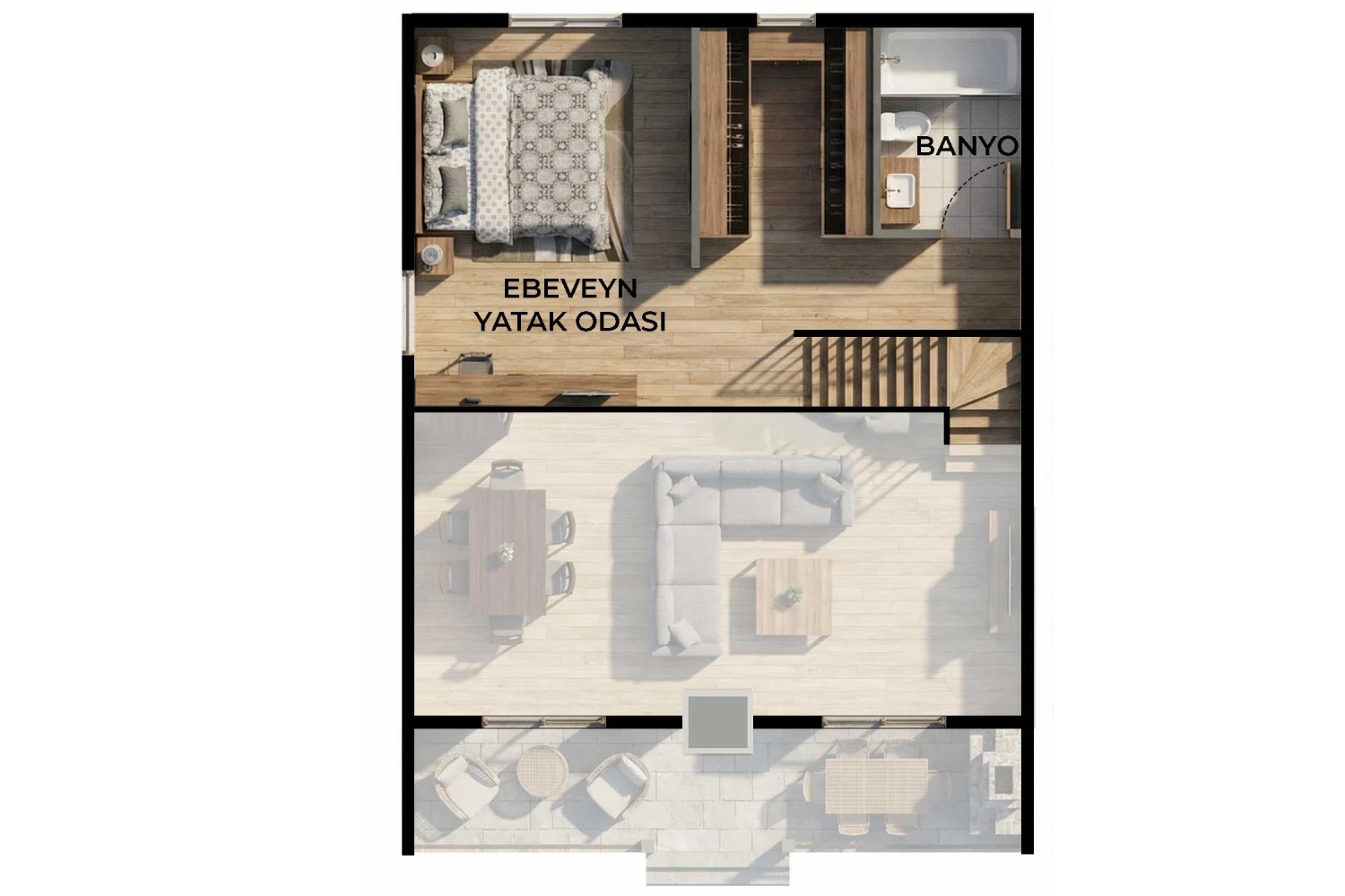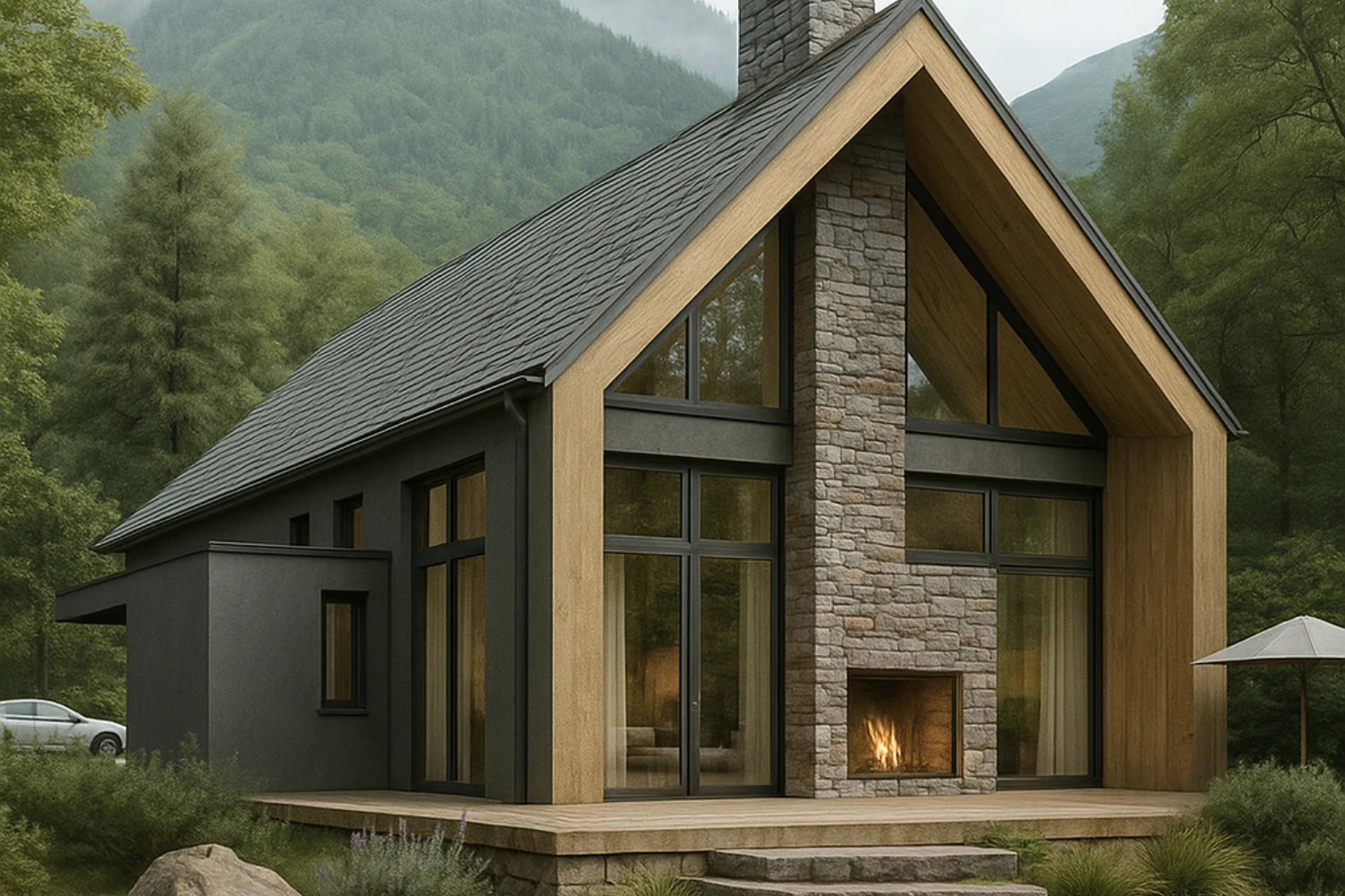 Yamaç Model, doğal arazi yapısına uyum sağlayan mimari kurgusu ve güçlü cephe detaylarıyla dikkat çeken tek katlı villa tasarımıdır. Yüksek eğimli çatı formu ve geniş cam yüzeyleri sayesinde iç mekânlar ferah ve aydınlık bir atmosfer sunar. Taş ve ahşap malzeme birlikteliği, yapıya hem doğal hem de karakteristik bir kimlik kazandırır. Yamaç Model, doğa ile bütünleşen, estetik ve fonksiyonel bir yaşam anlayışını yansıtır.